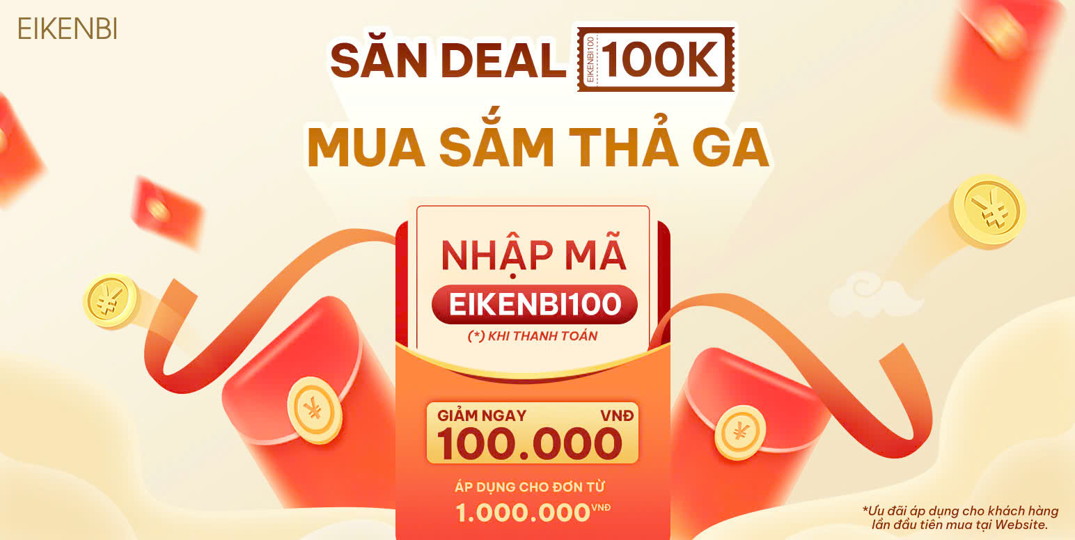 Nhập mã khuyến mãi "EIKENBI100" khi thanh toán, để nhận ngay ưu đãi giảm trực tiếp 100.000vnđ cho đơn hàng mua hàng đầu tiên từ 1.000.000vnđ trở lên tại website eikenbi.vn!